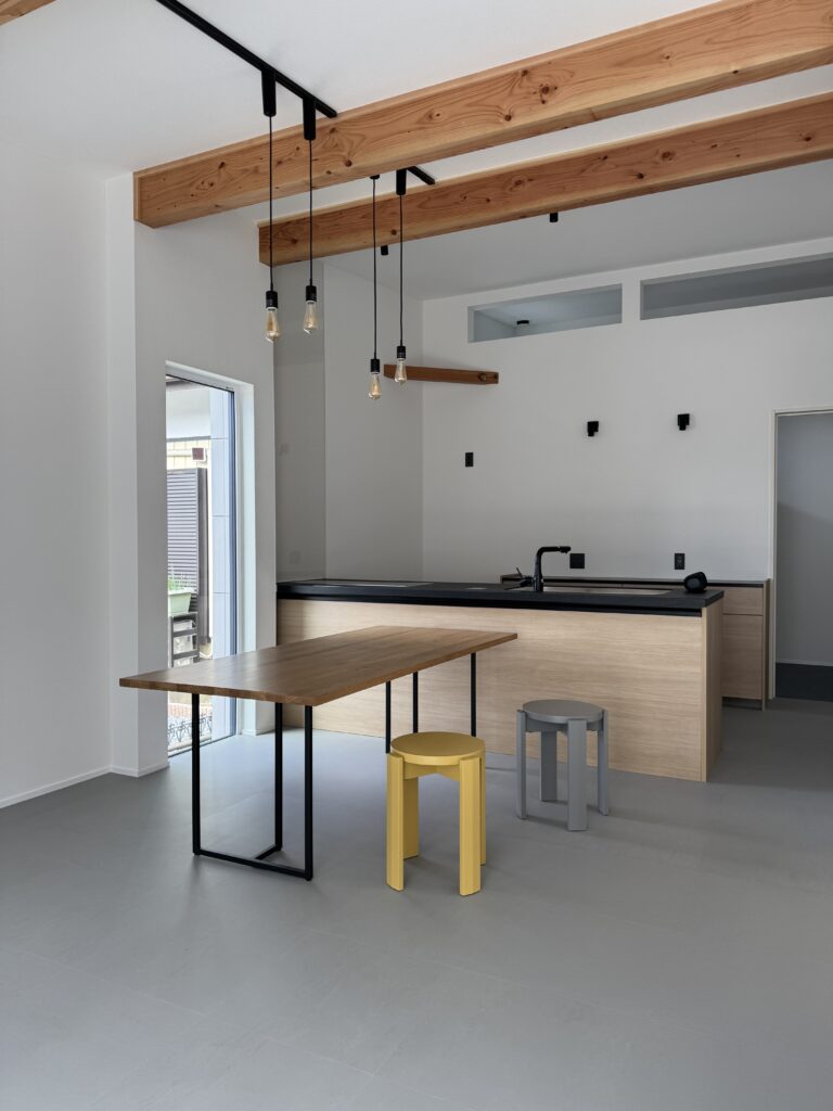 天井に走る木の梁が、空間にリズムと深みを与えています。